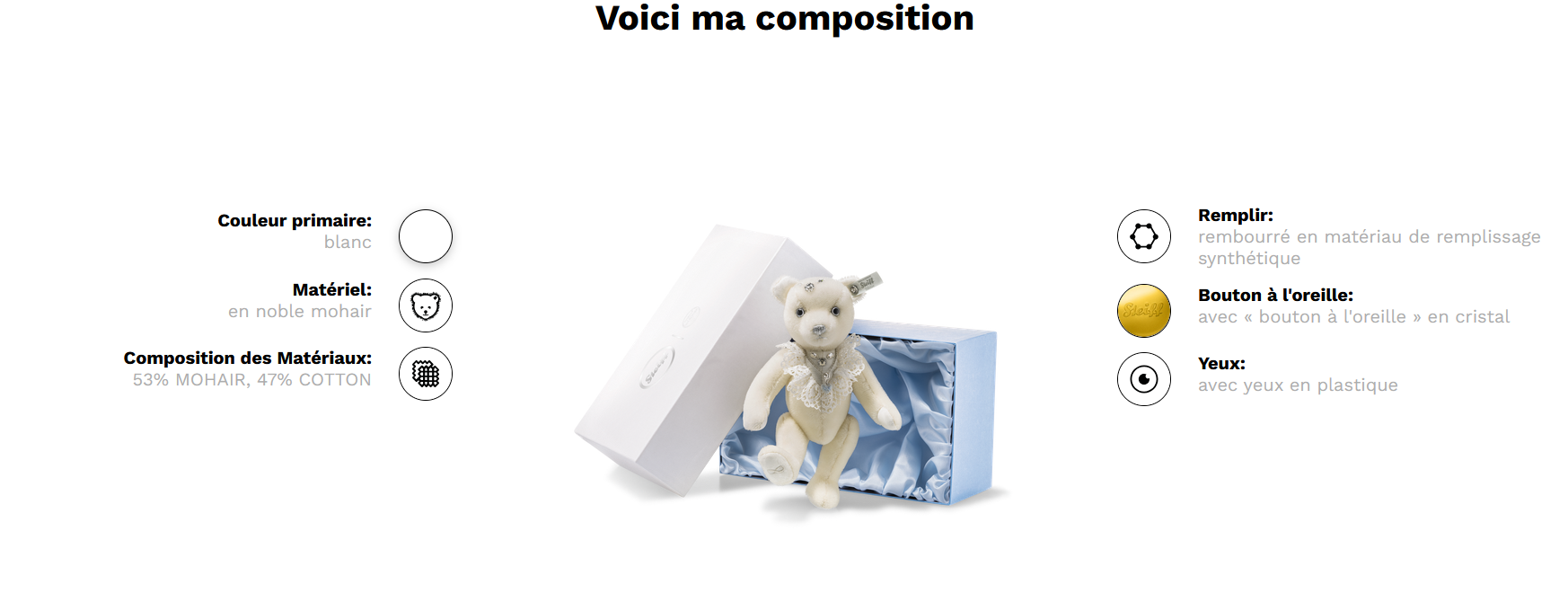 + Free ShippingParfaitement assortie à l’ours Teddy marié, elle mesure 26 cm. Grâce aux cinq articulations, la tête, les bras et les jambes bougent. L’ours Teddy mariée est en mohair blanc le plus fin. Le nez et la bouche sont soulignés d’un fil argenté. Les trois jolis crystals from Swarovski appliqués sur le côté droit de la tête comme un diadème sont très chics. D’autres crystals from Swarovski sont délicatement apposés sur la poitrine. Le joli collier avec un cœur en crystal from Swarovski peut être porté comme bracelet. Le symbole de l’infini est représenté sous le pied droit de l’ours Teddy mariée, en signe de l’amour et de la vie commune. Cette élégante pièce de collection est vendue dans le coffret-cadeau présenté.Crystals from Swarovski® Swarovski® is a registered trademark of Swarovski AG.