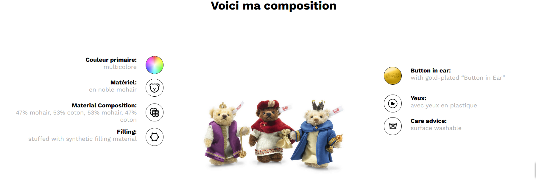+ Free ShippingTrois rois dans le meilleur mohair pour la crèche Steiff 2020 : le sombre Melchior, en jacquard clair avec des fils et des garnitures dorés, porte une cape en velours rouge avec des perles et un turban cousu à la main. Balthazar, de couleur cannelle, est vêtu de coton et d’une cape en jacquard bleu brillant, sa couronne est ornée de pierres scintillantes. Le pâle Gaspard porte une robe en jacquard avec des garnitures dorées et une cape de couleur violette. Leurs cadeaux sont un sac en or, un calice et un brûleur d’encens faits à la main … Amusez-vous bien avec le plateau des Rois Mages !